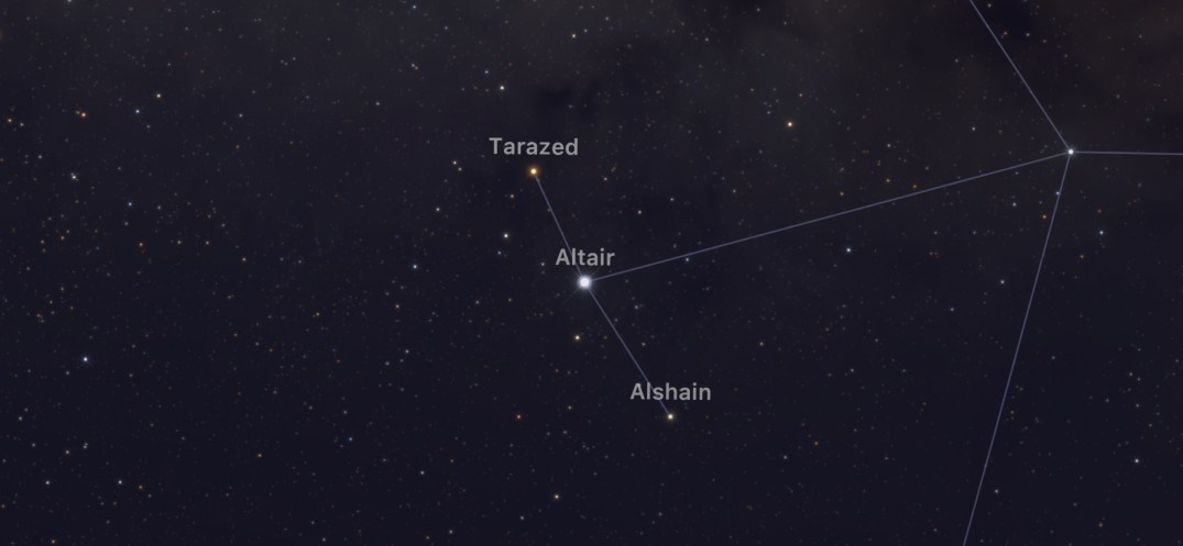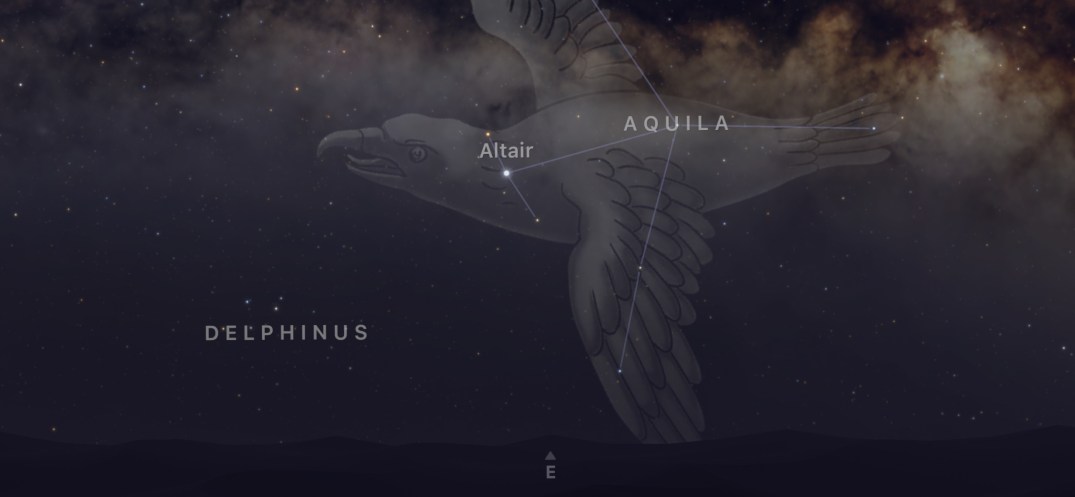 The very mature maple tree in Timothy’s yard (neighbor to the East) mostly blocks my view of the eastern and north eastern sky, except for a small gap between the tree and his patio roof, where one brighter star and one dimmer star are still visible to my naked eyes. According to Sky Guide, these are Altair and Tarazed of the constellation Aquila, The Eagle, The Thunderbird: