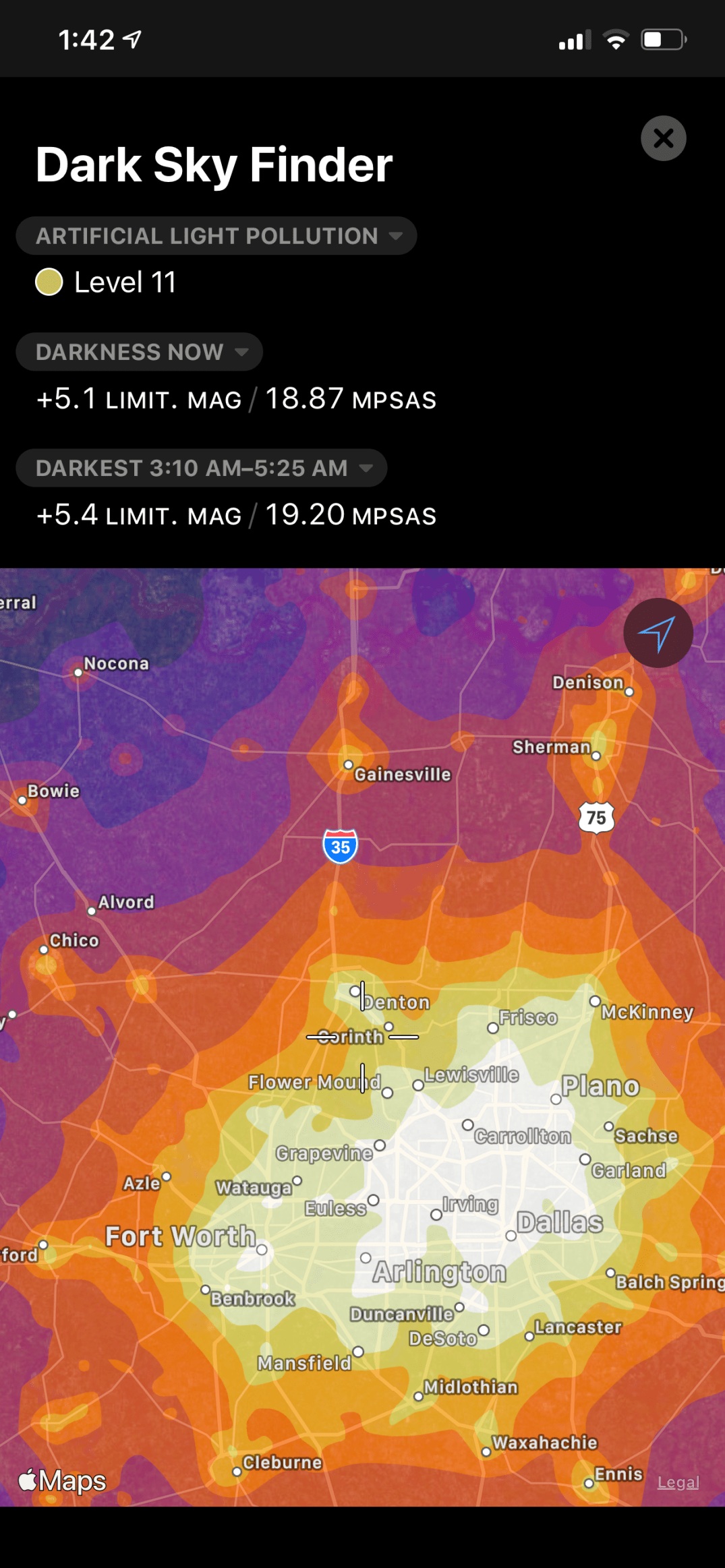 For having this much artificial light pollution, it’s interesting just how much less of the Sky we’re able to see. Our 24/7 cities and their inefficient street lights are sending light in all directions rather than concentrating it or restricting the beam of light. Here’s an example of the levels of ALP in the DFW metroplex: