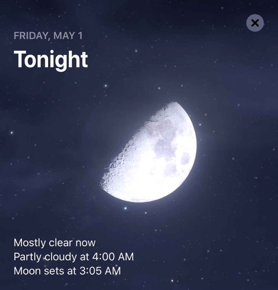 Didn’t turn on any lights as I arose from bed, walking to the living room/kitchen. Our gadgets emit enough light with their LEDs to see at night. Even with this much “light pollution”, I noticed it seemed strangely bright outside. And quite a bit louder than I thought it would be. Besides the cricket-like bug still chirping, there are also several birds tweeting back and forth. It’s 1:00 AM for chirping out loud!