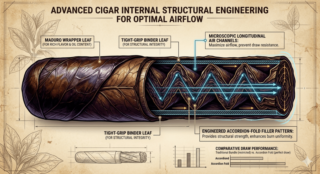 Even with the perfect 84th blend, the physical density of the Triple Maduro presented a mechanical crisis. Traditional rolling utilizes a “snail’s shell” pattern—a circular bunching that creates pockets easily blocked by the heavy oils of high-priming leaves. To solve this, Camacho engineered “Powerband bunching,” a highly secretive method of internal structural engineering where the fillers are folded in a “concertina” or accordion pattern.